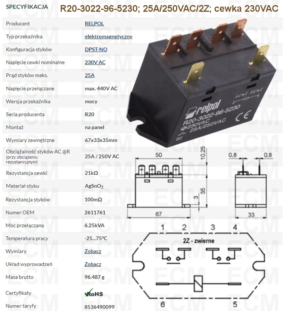 Wejście/cewka - wyprowadzenia: 5-6, napięcie zasilania cewki Un - 230VAC. Wymiary: 33x67x45,25 mm. Materiał styków: AgSnO2.