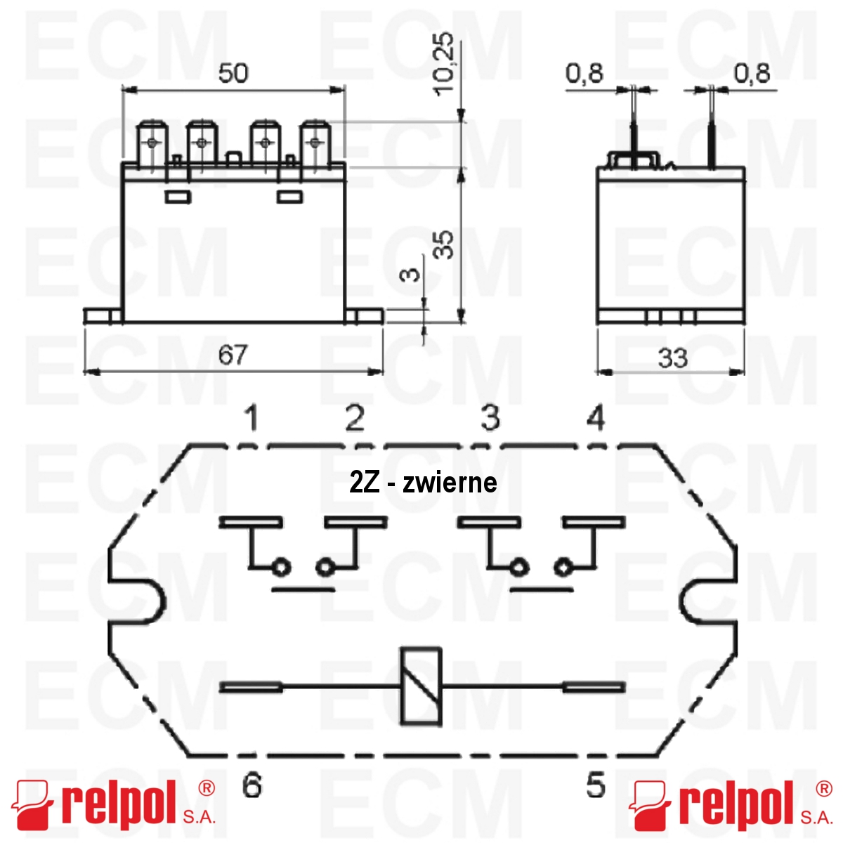 Faston 250 (6,3x0,8). Wyjście: 2Z - dwa zestyki zwierne typy "bridge" dwuprzerwowy - wyprowadzenia: 1-2; 3-4; AC1 - 25A/250VAC.