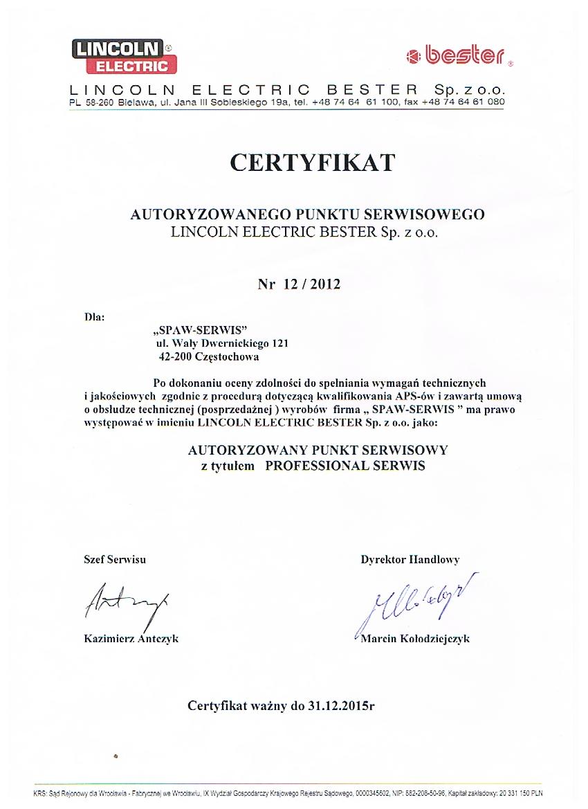 Autoryzacja „LINCOLN ELECTRIC BESTER” Certyfikat Nr. 15/2005, 3/2010, 2/2016, 18/2017, 5/2021