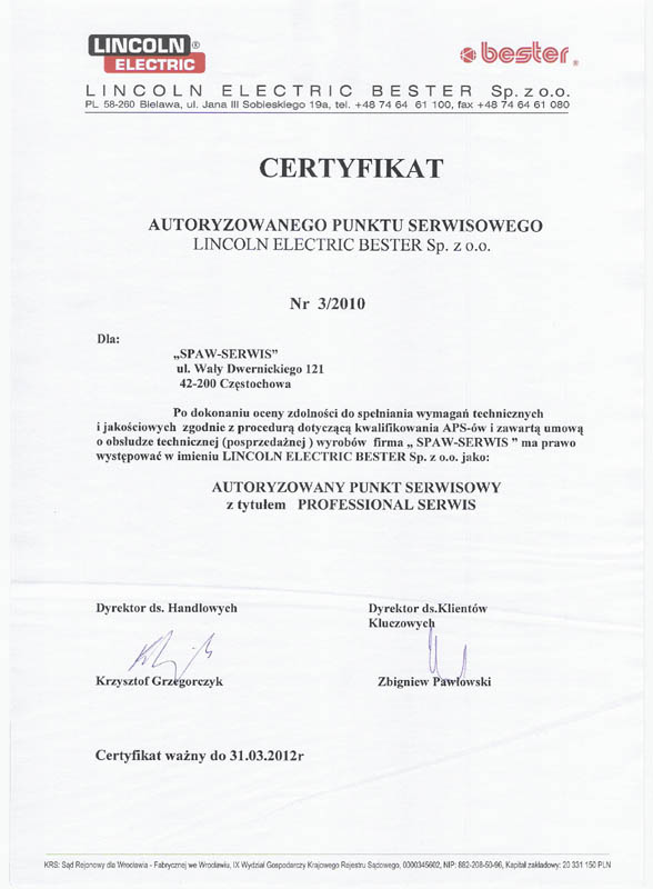Autoryzacja „LINCOLN ELECTRIC BESTER” Certyfikat Nr. 15/2005, 3/2010, 2/2016, 18/2017, 5/2021