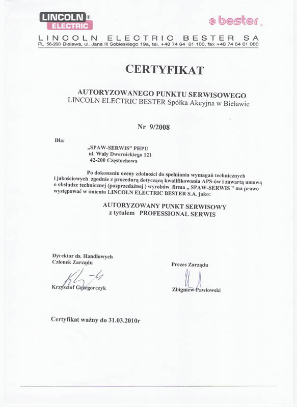 Autoryzacja „LINCOLN ELECTRIC BESTER” Certyfikat Nr. 15/2005, 3/2010, 2/2016, 18/2017, 5/2021